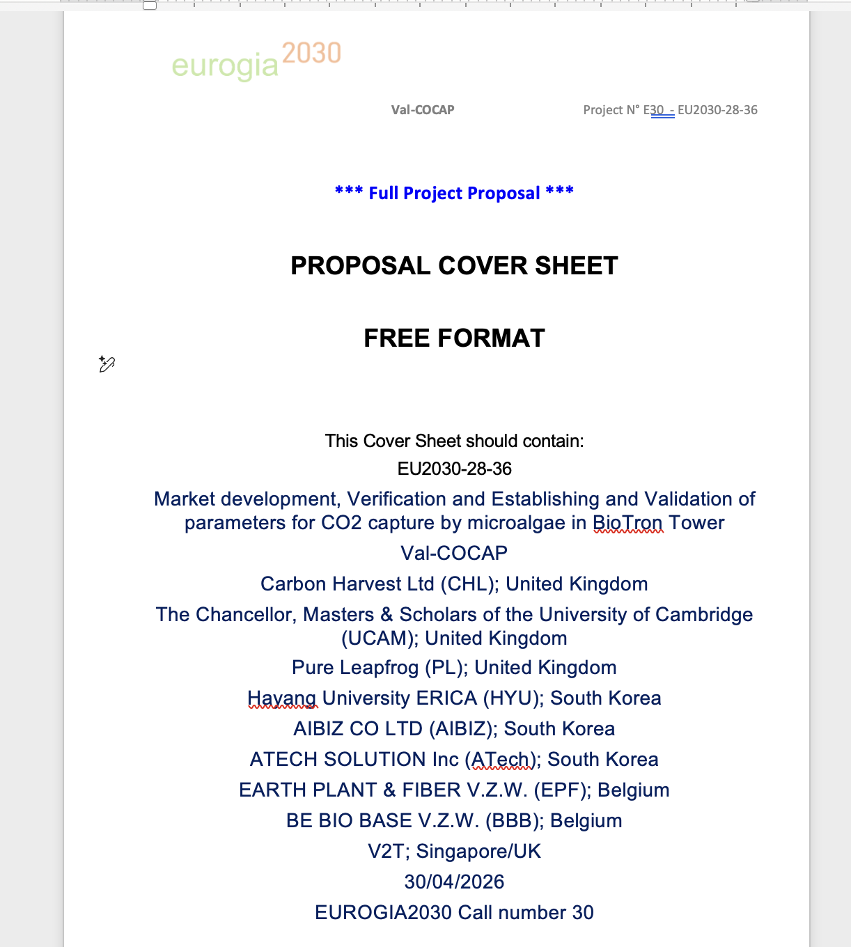 Val-COCAP will deliver the industrial validation and optimisation of a modular 1500L BioTron Tower photobioreactor for carbon capture and utilisation. The project addresses key barriers in algae-based systems, including performance instability, high energy demand, and limited economic viability. A structured 36-month programme will validate system performance under real-world conditions, establishing quantified productivity and CO₂ capture metrics. Energy consumption and carbon balance will be rigorously assessed to determine system efficiency and environmental impact. The project integrates advanced AI-driven control to optimise operational parameters and improve system stability. A digital twin model will enable simulation-based optimisation and validation of control strategies prior[...]